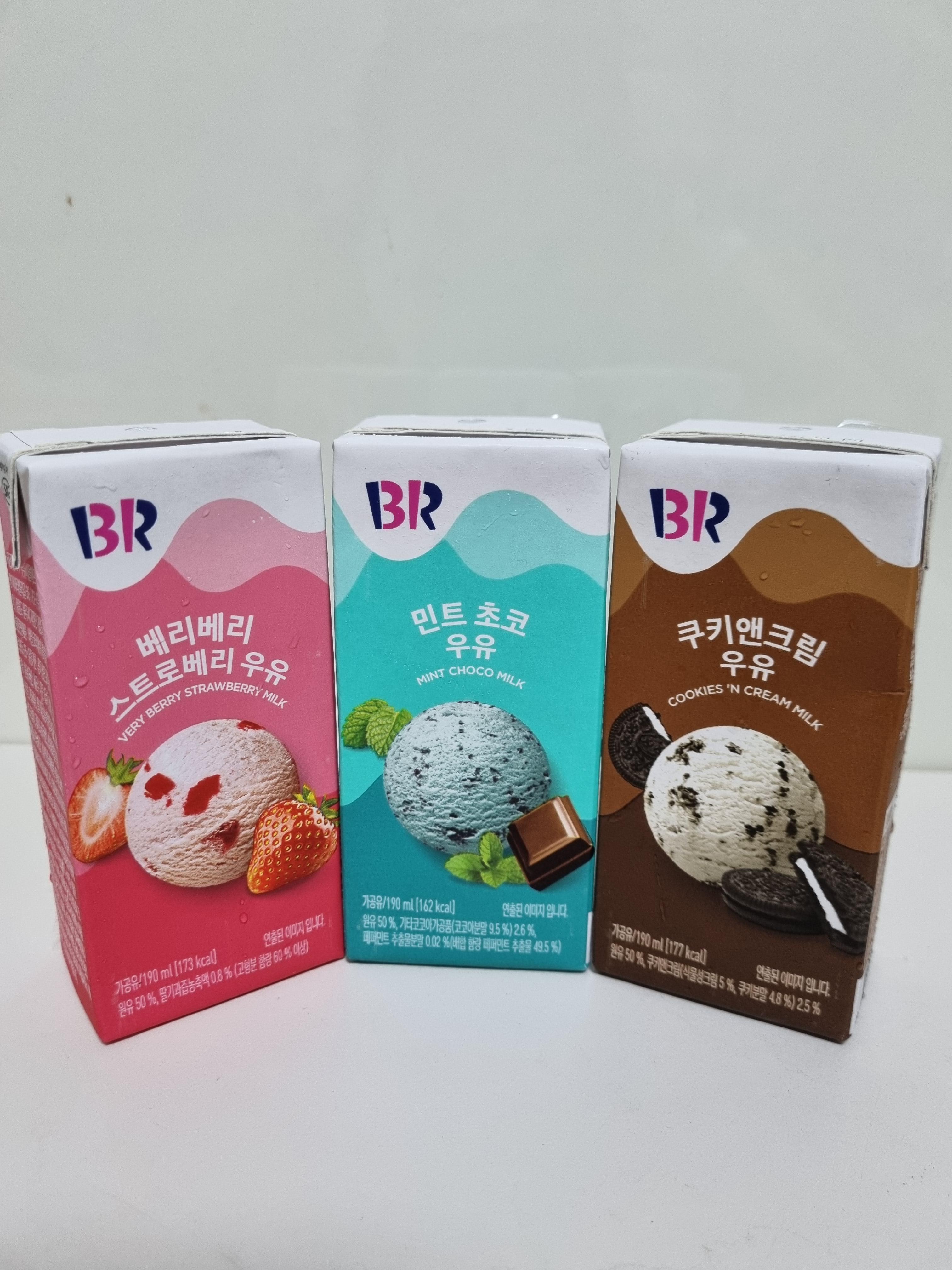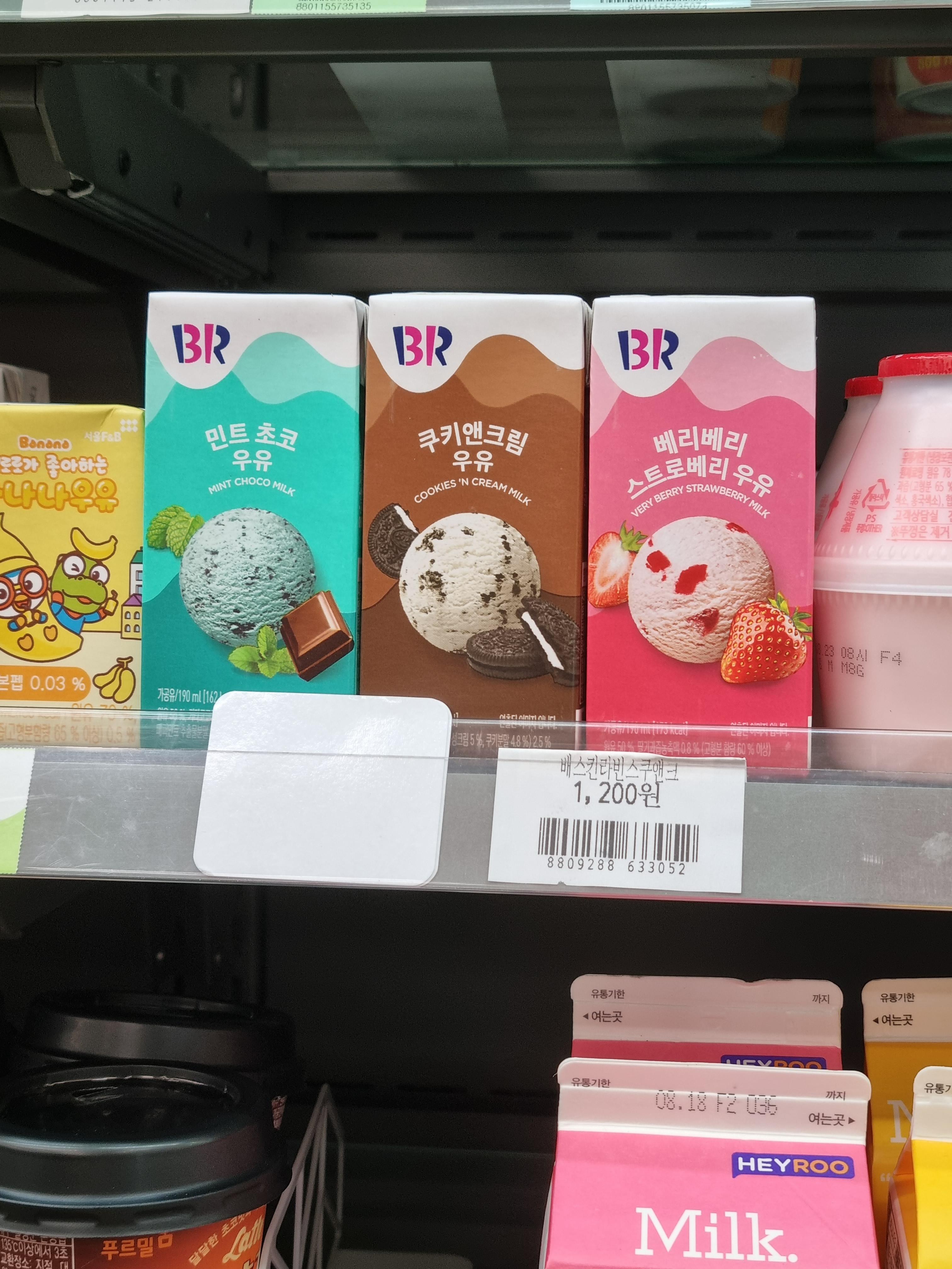 배 라에서 파는 민트 초코랑 쿠키 앤 크림 우유랑 베리베리 스트로베리 맛 나는 우유라고 써있길래 진짜 그런 맛이 나나 하고 가서 사 와봤다 ㅋㅋ 저거 하나당 가격이 1200원이었는데 비싸다.ㅋㅋ가격이 저렇게 비싼만큼 배라 맛을 잘 구현했으리라고 믿고 사 와봤다. 지금은 8월 행사 중이라서 1,000원에 팔고 있었다..